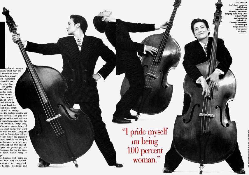 "One way or another, gender bending has always been lang's stock-in-trade. At first glance she seems undeniably bizarre, but hers is a deeply subversive presence; after you watch her for a while you realize how warped your own stereotypes are. In the beginning you simply see her as unnatural. Her face is utterly bare, devoid of makeup. Her hair has been shorn with what appears to be complete disregard for how flattering the results will be […] She wears clothes that don't reveal or exploit her body, clothes to move in, and boots that could carry you for miles. You can watch her for years and never even be aware she has breasts. She is as different from a female icon like Dolly Parton as if she were another species."